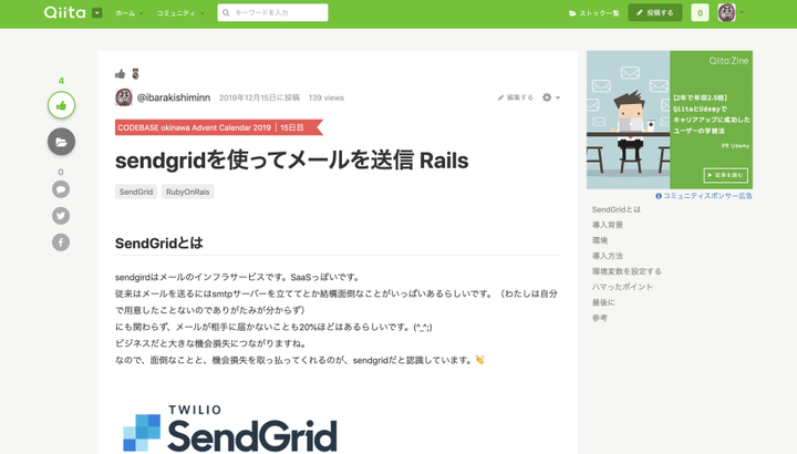 Qiitaにプログラミングを学習したことや、備忘録を日々掲載。 年末にあったQiitaのアドベントカレンダーでsendgridについて記載。