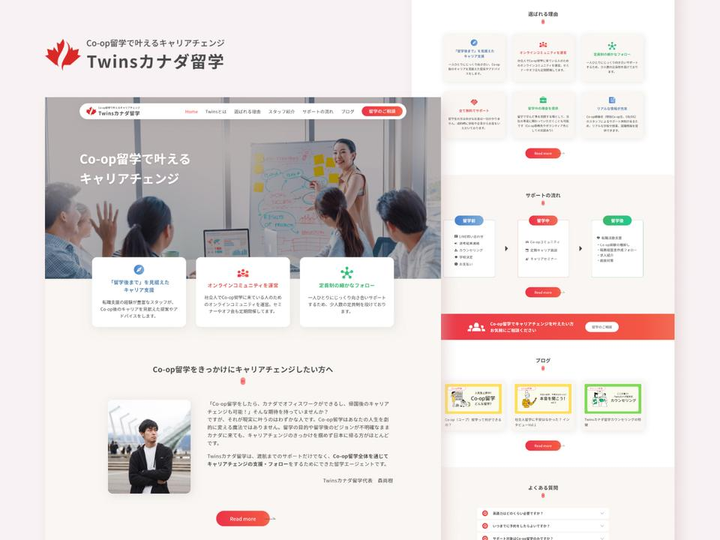 カナダのCo-opプログラムを通して、キャリアチェンジをしたい社会人をサポートする新しい留学エージェントのWebサイトを制作(7ページ)※詳細は下記URLのポートフォリオに記載。
