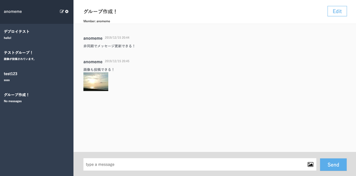 非同期更新の知識を深めるため、チャットアプリを作成しました。 グループ作成後、ユーザーを招待でチャットができます。 また、ユーザーは登録されている名前をインクリメンタルサーチ可能です。 開発環境 言語:Ruby 2.5.1 フレームワーク:Ruby on Rails 5.0.7.2 サーバー:AWS (EC2サーバー、画像はS3使用)