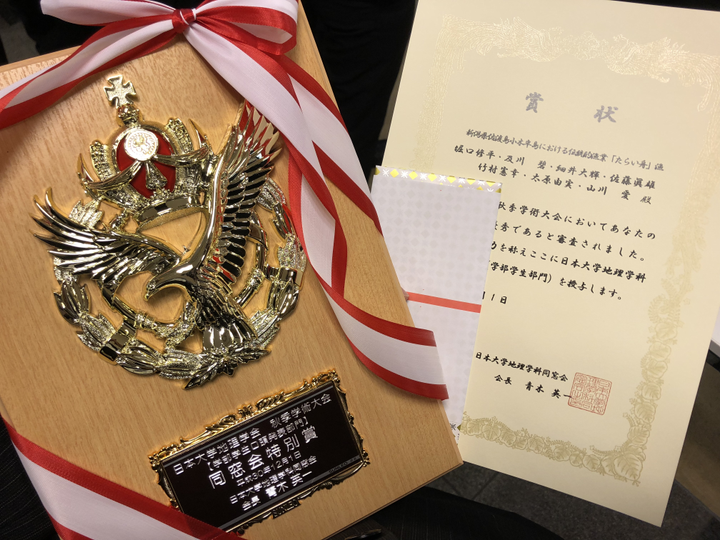 日本大学地理学会の秋季学術大会にて研究成果を発表、実際に解説と答弁を行う発表者を務める。 結果は同窓会特別賞、当学術大会において2位相当の賞に認められた。