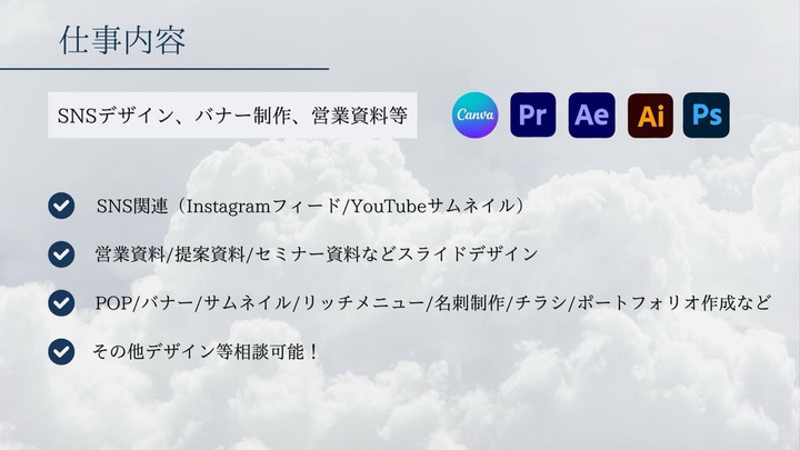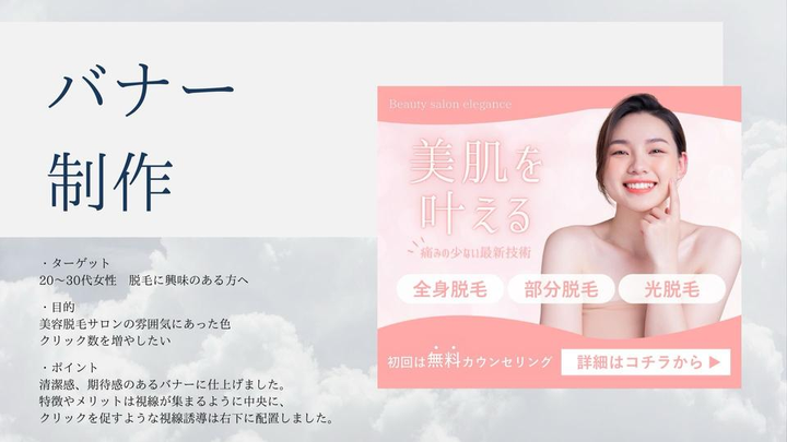 本ポートフォリオでは、これまでに取り組んだSNS用バナー制作を中心に掲載しています。 美容・ライフスタイル・スライドなど、20〜30代女性をターゲットにしたデザインを得意としており、透明感・シンプルさ・おしゃれ感を大切に制作しました。 作品ごとに「ターゲットに伝わりやすい構成」「見やすさと世界観の両立」を意識しながら、配色・フォント・余白の使い方を工夫しています。 今後は実案件を通じて経験を積み、SNS運用や広告デザインなど幅広い分野に挑戦していきたいと考えています。