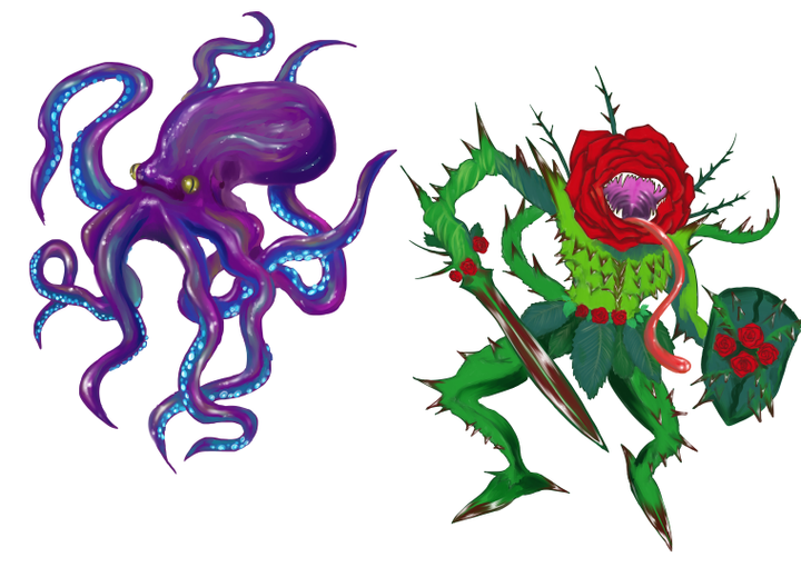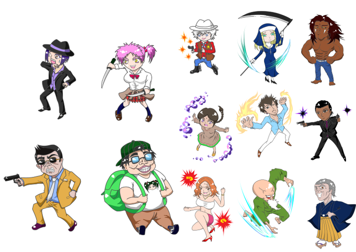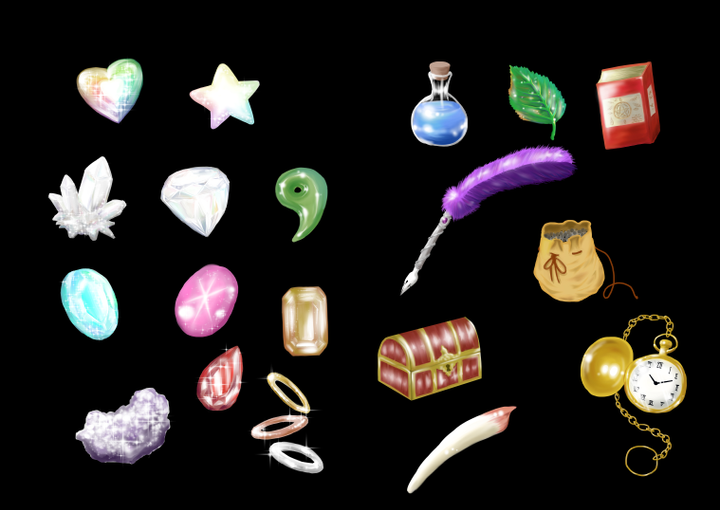 キャラクターやアイテムの見本です。普段の画風やアニメ風、デフォルメにモンスターなど、テイストを変えています。