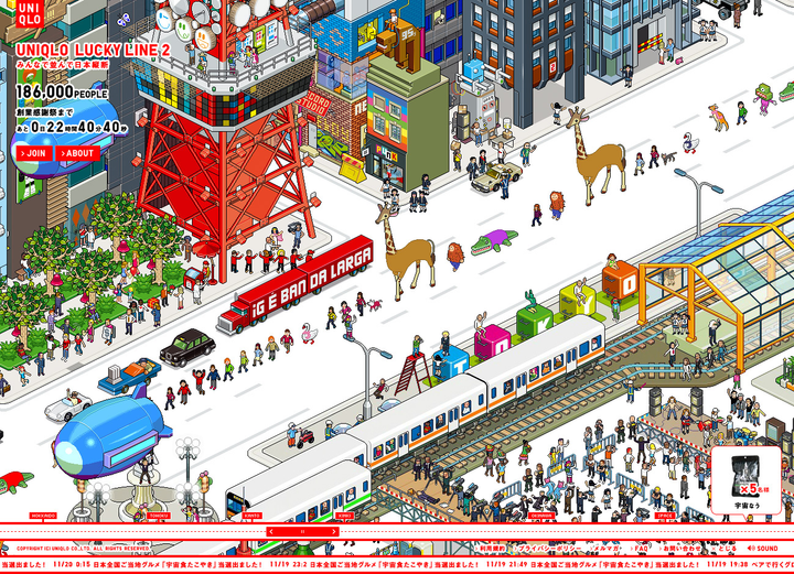 前々職のTHE STRIPPERS 時代の仕事です。UNIQLOのセールに合わせFlashサイトの中で行列ができ、クーポンが当たるキャンペーンサイトです。イラストはベルリンのイラストレーターチームe-boy。オブジェクト単位で支給された多数のイラストパーツをもとに、デザイナーとして関わった私が自由に「行列したくなるような街並み」をデザインしました。本キャンペーンは好評を得て、日本の他、韓国、中国版と続編が打たれ、その制作にも携わりました。また、本デザインにてD&AD Award Graphite Pencilを受賞致しました。