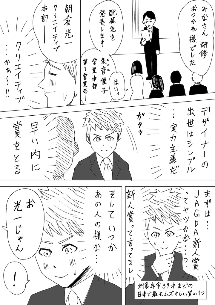 クリエイティブ本部に配属され、沢村チームのメンバーに。 「はやく戦力になりたい」「はやく賞をとってのしあがりたい」と野望を燃やしていたが、上司からは「焦るな、会社はお前を育ててくれない」と言われる。