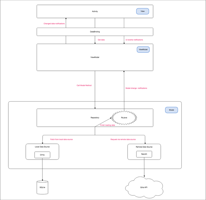 AndroidアプリのLightQiita(https://github.com/kaki-cl/light-qiita) を開発するために作成した概略図です。 DataBindingを用いたMVVMを選びました。 また、ライブラリでRxJava2、Retrofit、Ormaを使用しました。
