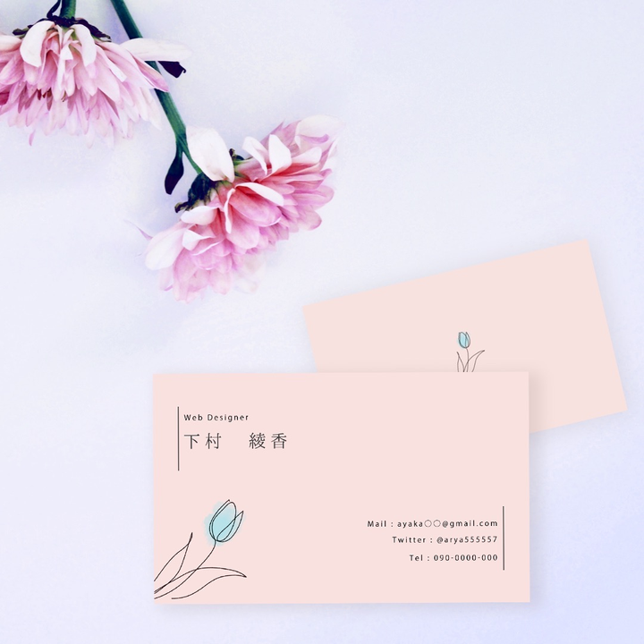 【用途】 クライアント様にお渡しする時の名刺 【こだわった点】 受け取った方がぱっと見でわかりやすいよう 全体的に余白を大切にして、情報をまとめるように 気をつけました。 シンプルな中にも好きな花のチューリップや、アクアマリンの色をのせて個性を出しました。