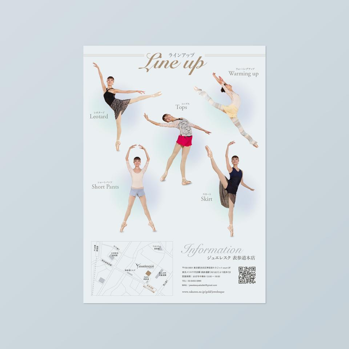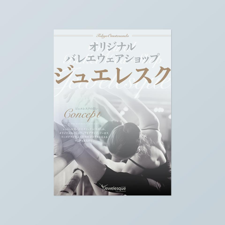 東京青山に店舗を構える、バレエウェアショップ「ジュエレスク」のショップチラシデザインのコンペに応募いたしました。 ホームページや既存ロゴのイメージを参考に、ブルー・シルバー・ゴールドを基調したカラーで設計。 全体を通して適度にパステル調のグラデーションを使用することで、高級感もありつつバランス良く親しみやすい印象を持たせて、ブランドコンセプトに寄り添った提案にしました。