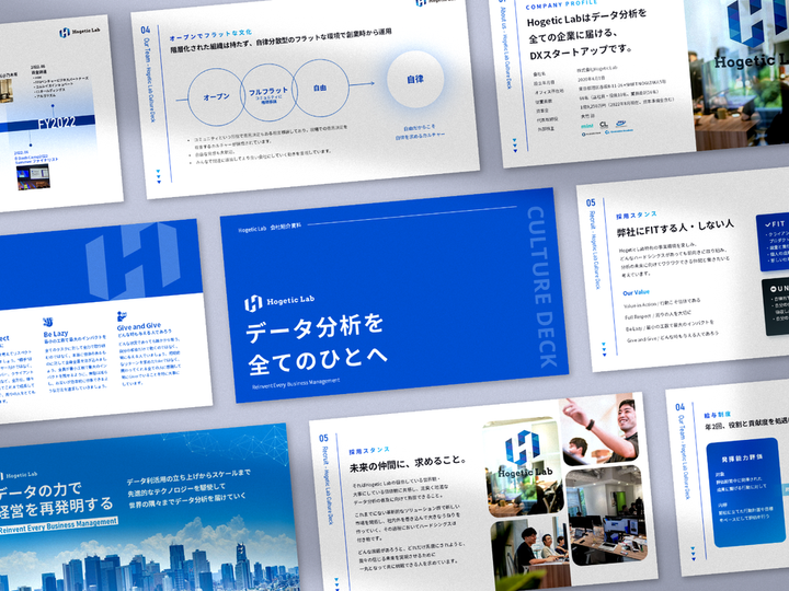 データ分析ツールやデータ分析者の育成・分析組織立ち上げの支援を提供するHogetic Lab株式会社様の採用向けカルチャーデックをデザインさせていただきました。 会社紹介をはじめとして、採用スタンスや価値観、制度などを1つ1つ丁寧に記載し、入社後のイメージが明確にもてるような資料を目指して制作しました。