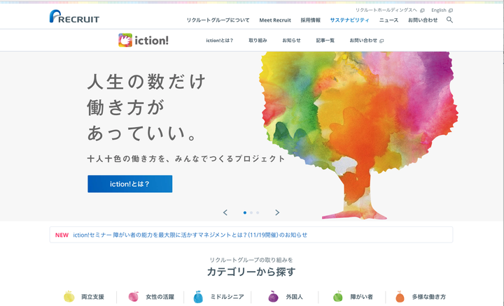 Recruitグループの「十人十色の働き方を、みんなでつくるプロジェクト」であるictionのwebサイトを作りました。メインデザイナーとして関わりました。