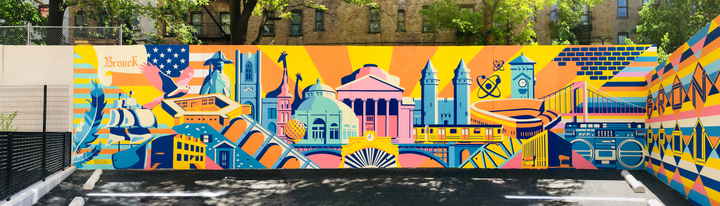 Creative Agency: Alfalfa Studio (New York, USA) Client: B&B Urban Alfalfa Studio デザインチームは、B&B Urbanとともに、貧困地区であるニ ューヨーク・ブロンクスの低収入世帯やホームレスの人々が住める 集合住宅開発において、住宅ビルディングの3つの壁画デザインを担当しました。 デザインコンセプトは、ビルディングが建つブロンクスの歴史を振り返ったものです。1600年以前にこの地に住んでいた、ネイティブアメリカンであるSiwanoyの部族から始まり、1970以降から今に続くブロンクスのヒップホップムーブメントを、ブロンクスの活気あるカラフルなイメージでデザインしました。 担当: オリジナルデザインを手書きからグラフィック作成まで他デザイナーと二人で担当、ペイントをデザインチーム他5人とともに担当しました。