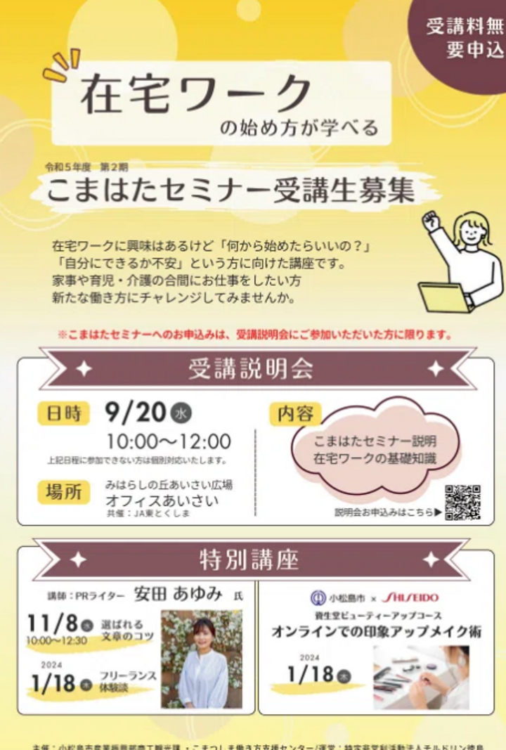 徳島県小松島市の「働き方支援」を目的とした「こまはたセミナー」に、講師として参加させていただくことになりました。 本セミナーでは11/8に「選ばれる在宅ワーカー」になるためのプロフィール文章の作成について、翌年の1/18は小松島市にて自身の体験に基づいてお話ししました。