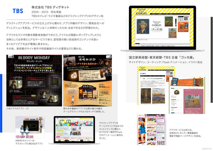 テレビ東京のドラマ、バラエティーなどの番組サイトデザイン業務、情報更新を担当。 グラフィックが得意だったこともあり、ドラマサイトの他、隅田川花火大会サイト、フィギュアスケート番組特設サイトなど、大きな案件を多数任される。