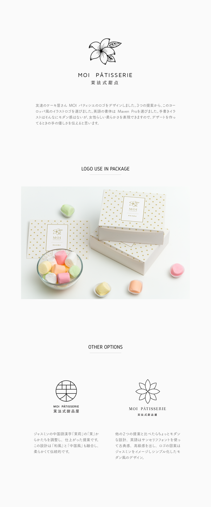 友達のケーキ屋さん MOI パティシエのロゴをデザインしました。3つの提案から、このヨーロッパ風のイラストロゴを選びました。英語の書体は Maven Proを選びました。手書きイラストはそんなにモダン感はないが、女性らしい柔らかさを表現できますので、デザートを作ってるときの手の優しさを伝えると思います。