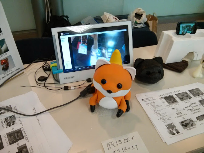 Androi、Arduino、OpenCVを使って顔認識で人を見つけると振り向いて手を振るロボットです。Android StickにUSB WebカメラとArduinoを接続し、画像解析やサーボモーターの制御を行なっています。筐体は3Dモデルを一から起こし、3Dプリンターで印刷したものを塗装、組み立てて作っています。