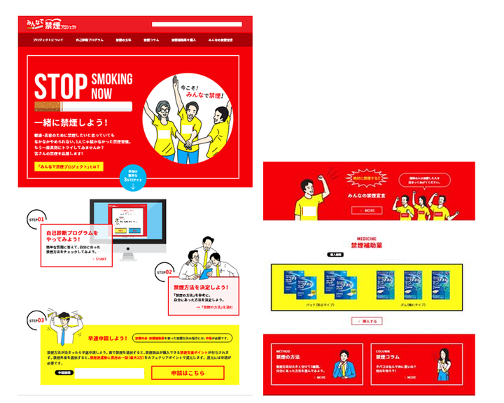 健康保健組合・事業主健康増進室と共同で禁煙サポートプログラムを開発。 従来の「禁煙は面倒...」というイメージを払拭する為、会社全体で禁煙挑戦者を応援!という前向きさを前面に出したサイトデザインを考案。(製作は社内の Web デザイナー) また、健保補助が適用されたオンラインでの禁煙補助薬購入システムや自己診断プログラム等を医薬品提供業者、システム部門(SE)と共に構築。 多くの企業や健康保健組合で“受動喫煙対策”に頭を悩ませる中、サイト上で「診断→申請→購入」が完結するプログラムを先駆けて実施した為、成功事例として各方面より問合せを受けた。