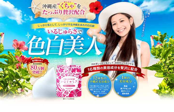 80万個を大ヒットした沖縄くちゃ石鹸。 「いるじゅらさ」とは、沖縄方言で「肌透明美人」のことを言います。 沖縄の珊瑚や海藻が蓄積したミネラルの豊富な泥「くちゃ」や、潤い成分「プラセンタ」「ヒアルロン酸」「馬油」「もずく」「アロエ」等、 まさに沖縄ならではの素材をたっぷりと配合し、お肌の潤いをケアしながら肌本来の美しさに導く、夢のような石鹸です。