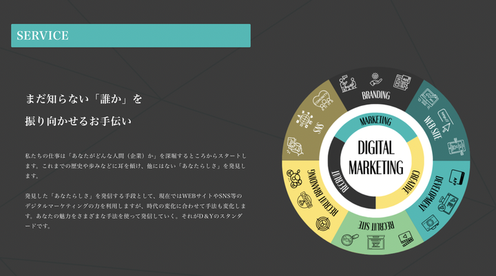 『まだ知らない″誰か″を振り向かせるお手伝い』をミッションに私達は、戦略立案からプロジェクト企画・実装・マーケティング運用まで、DX推進の全フェーズでお客様の価値創出を支援し、デジタルマーケティングをサポートします。 具体的にはプロジェクト企画を策定し、WEBサイト制作、SNSマーケティング(Instagram,TikTok,You Tube),SEO対策,WEB広告運用、UI/UX改善と、お客様の価値創出を目的とし、デジタルマーケティングに関わる全てをワンストップで提供します。