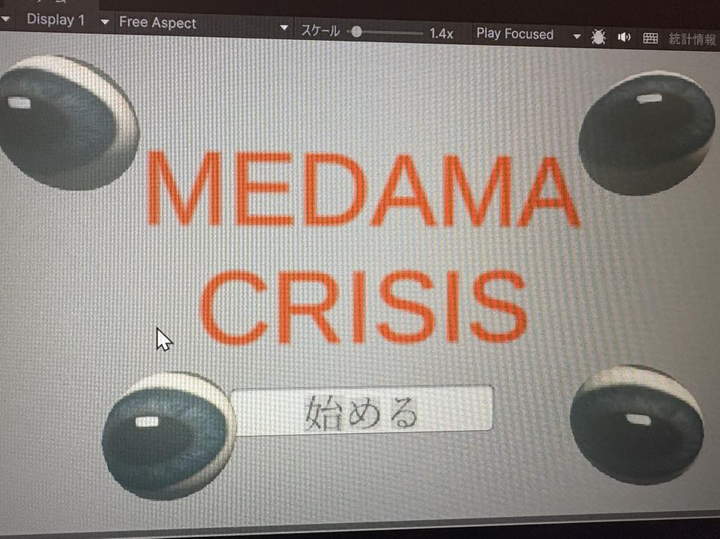 unityで自身で初めて作るゲーム。 プレイヤーの目玉を操作し、最終的に人間の目に辿り着くのが目的のゲーム。 WASDで目玉の操作、スペースキーでジャンプが5回できる。 パワーアップアイテムとして「まつげ」を手に入れると無限にジャンプが可能になる。 何故このようなアイデアが出たのかは、自分でも不明です。ノリとテンションです。 unityの勉強をしながらおよそ1ヶ月で作ることができました。 一番大変だったのはタイトル画面と目玉のジャンプ&パワーアップアイテムの反映のスクリプトを組むことでした。