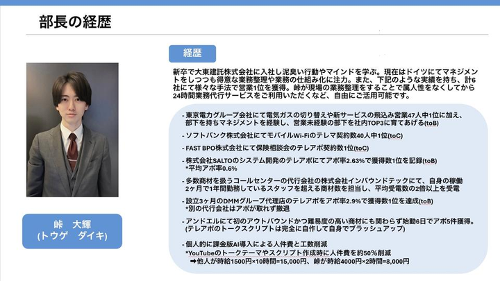 2025年4月3日に開業届を出し、2025年5月1日からSalesaurus(セールスザウルス)として独立。 現在は営業代行・人材アウトソーシングなどを提供しています。