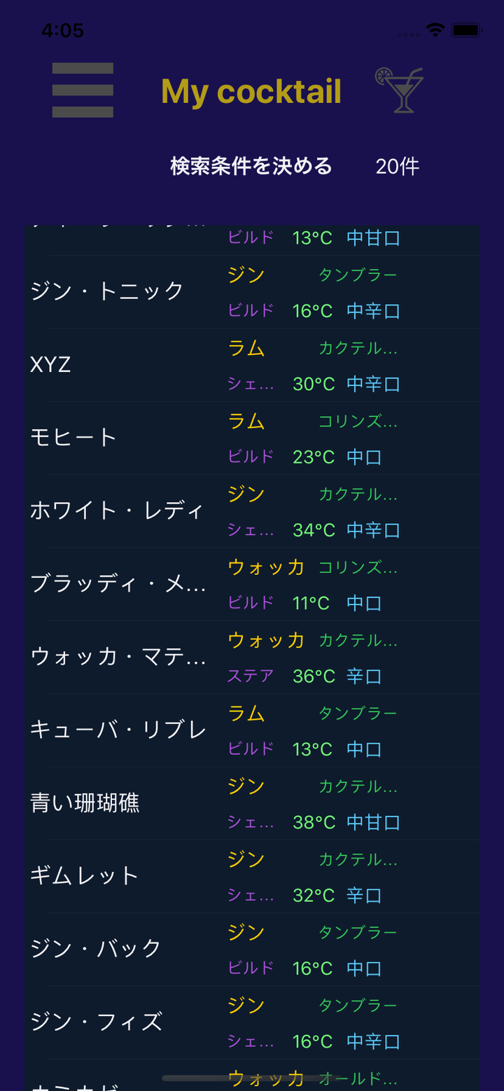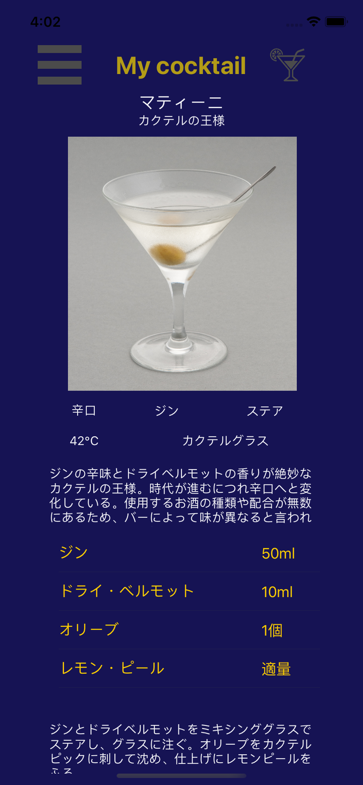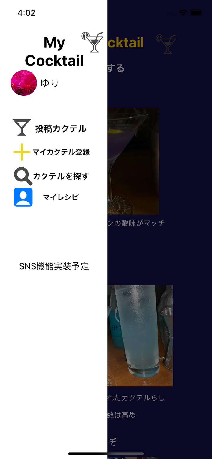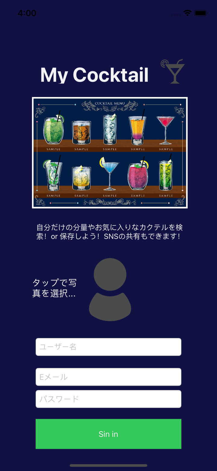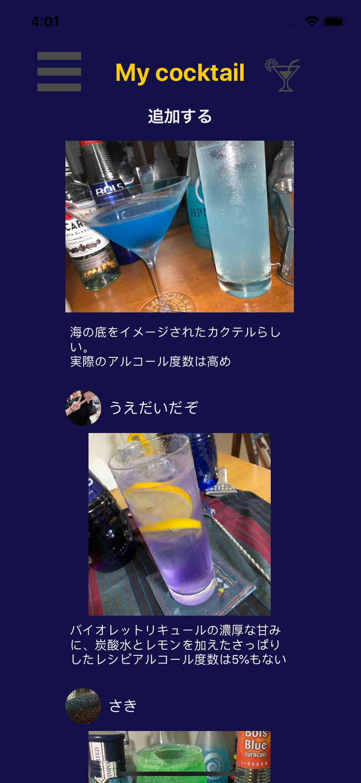 初のiosオリジナルアプリケーションです。 カクテルに関する投稿や保存、検索などができます。 感想としては、iosむずい…て思っちゃったのが本音です(笑)(楽しいけど) Swiftは他の言語に比べて、データの型に非常に厳格でどうしても時間がかかってしまいました。ネットの記事を見てた時間のほうが長いと思います。 ですが、かなり基礎は学習できたかと思います。 使用したライブラリ・技術 Firebase, Firebase/database, Firebase/storage, Firebase/Auth, Firebase/Core, SDWebImage, lottie-ios, Alamofire, SwiftyJSON cocktailAPI, Google Custom SearchAPI UserDefalts, TableView, CollectionView, JSON解析, https Request 等 GitHub https://github.com/mama-sho/ios-myRecipe