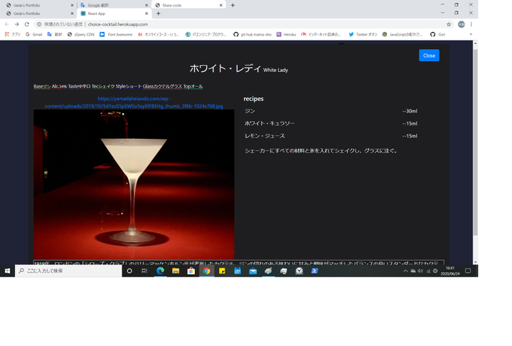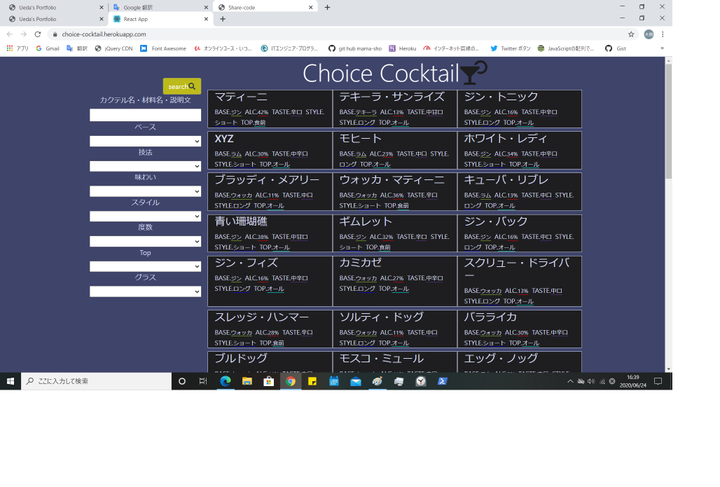 こちらは、お酒のベースや、技法、味わいなどで条件を絞ってカクテルレシピを検索できる、シングルページwebアプリケーションです。 作成しようと思ったきっかけは、趣味でカクテルを作ることがあるのですが、数あるカクテルの中で、作る物を選ぶのに、時間がかかってしまったり、同じものばかり作ってしまうので、気軽に条件で絞り込み検索ができるツールが欲しいと思い作成しました。 GitHub https://github.com/mama-sho/cocktail