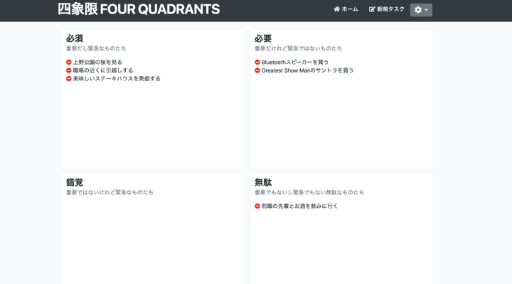 スティーブン・R・コヴィーによる「7つの習慣」から着想を得たタスク管理アプリです。 サーバーサイドはRuby on Rails、クライアントサイドはBootstrap4でデザインしました。 重要度・緊急度マトリクスによって自分の頭の中を整理することができます。業務上のタスクではなく、あくまでもあなたの人生における重要度・緊急度を重視しましょう。