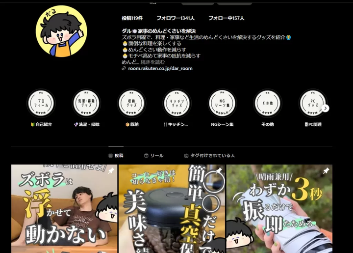キッチングッズを中心に、購入した日用品のレビューを投稿するアカウントを運営。日々の家事などで感じる「めんどくさい」を少しでも和らげてくれるアイテムを紹介するのがコンセプトです。 1.8万回再生されたリール動画もあるなど、主婦を中心に家事を楽にしたい多くの方に見ていただけています。 2024年12月にはニトリさんの新商品PRのお仕事をいただき、ドラム式洗濯機をニトリ豊中三国店で体験。実験室やモデルルームをご案内いただき、取材内容を動画に落とし込みました。ニトリさんとの共同投稿&広告出稿により、24.2万回再生を至っています。※2025年1月現在