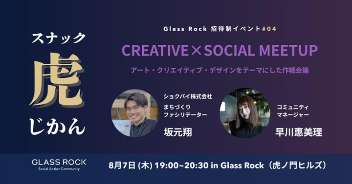 スナック 虎じかん特別編:CREATIVE × SOCIAL MEETUPを開催しました。 会員さんと企画・運営を行い、クリエイティブで社会課題解決に繋げるためのワークショップ第一弾を行いました。 以下詳細 スナック 虎じかんは、Glass Rock メンバーと、そのゲストが集う招待型イベント。メンバーの皆さまは、「推しのやばい変人=虎」を1名連れてご参加いただきます。 普段は、クローズドな空間で濃いつながりをつくる会ですが、今回の特別編はテーマを持たせ、「アート・デザイン・クリエイティブな目線から社会課題解決のために何ができるのか」を参加者同士で意見交換をしながら、ネクストアクションに繋げられるような濃いディスカッションを行います。 今回のミートアップは、個人会員のさかもんと、コミュマネのエミリによる「社会課題解決につながるアートやクリエイティブを創出し、対話や批評が生まれるような流れを作りたいよね」という会話が発端となり企画しました。クリエイティブ × 社会課題 に注目して、その事例なども紹介しながら様々な異なる視点から対話を深めます。まずはGlass Rockでの社会課題解決を目指すひとや活動の可視化を、クリエイティブな力で実現するためのミートアップに参加しませんか? 参加者同士の情報交換や前向きな対話が安心してできる環境で行われる虎じかん。同じ目的を持つ人たちの濃い出会いをお楽しみください。