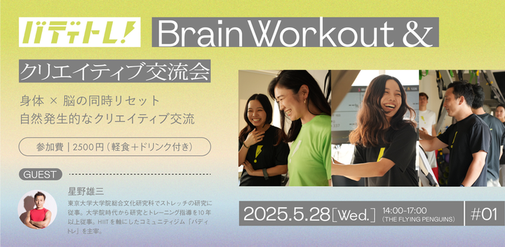 【コラボイベントの企画・運営・クリエイティブ制作】 Brain Workout&クリエイティブ交流会 #1 たった15分のBrain Workoutで、あなたの創造力は覚醒する。 クリエイターのための脳科学×運動プログラム「Brain Workout&クリエイティブ交流会」a 東大院出身の脳×身体スペシャリスト 星野雄三氏が明かす 「運動が脳のパフォーマンスを高める」科学的メカニズム ──あのアイデアブロックを突破するのは、デスクの前ではない。 身体を動かすことで、脳内物質BDNF(脳由来神経栄養因子)が活性化。 クリエイティブ思考力が最大28%アップ!? ▼ 参加者限定の特典 ・クリエイティブ仲間とのリアルネットワーキング ・即実践できる「脳覚醒エクササイズ」 ・仕事の質を高める"脳にいい食事"マニュアル付き 【開催概要】 ⚫︎イベント名:Brain Workout&クリエイティブ交流会 #1 ⚫︎開催日時: 2025年5月28日(水) 14:00-17:00 ⚫︎開催場所: THE FLYING PENGUINS ⚫︎所在地:103-0027東京都中央区日本橋 2丁目-2-18にのに八重洲仲通りビル 2F (東京メトロ銀座線、東西線「日本橋」駅A7出口徒歩1分) ⚫︎参加費:2,500円(軽食+ドリンク付き) *定員制・先着申込み* ⚫︎主催:株式会社バディトレ(代表:星野雄三) ⚫︎会場運営:Salon de thé nemunoki 株式会社バディトレについて バディトレは、「短時間・高強度」のトレーニングを中心にしながら、コミュニティの力で運動を継続しやすくする新しいタイプのフィットネスジムです。 高強度のトレーニングを短時間で行う … 忙しい方でもスキマ時間で効率よく運動。 コミュニティを通じたモチベーション維持 … 仲間同士の声かけや目標シェアで長続き。 手の届く料金設定 … パーソナルジムよりリーズナブルに利用可能。 これらを組み合わせることで、ジムにありがちな「行かなくなる」「やめてしまう」といった問題に対して、具体的な解決策を提供したいと考えています。 私自身、東京大学大学院で研究を行う傍ら、パーソナルトレーナーとして約4,000名以上の方を指導してきました。その中で、「ジムはストイックすぎて続けられない」という声を多く耳にしました。一方、無人ジムでは物足りない、パーソナルジムは料金が高い――このギャップを埋めるべく、コミュニティの力を活用した新たな形態が必要だと痛感したのです。 これまでのジムに多い「競争」や「自己管理」の概念だけでなく、「仲間とのつながり」や「遊戯性」を大切にしています。心拍数を可視化したり、定期的にフットサルや飲み会などを開催して、運動をもっと身近で楽しいものにする。そこで、コミュニティを通して運動を“続ける”仕組みを作り、現在、渋谷・恵比寿・本郷にてコミュニティ型のフィットネスジムを展開し、多くの皆様に「運動の習慣化」を提供すべく、サービスを展開しています。