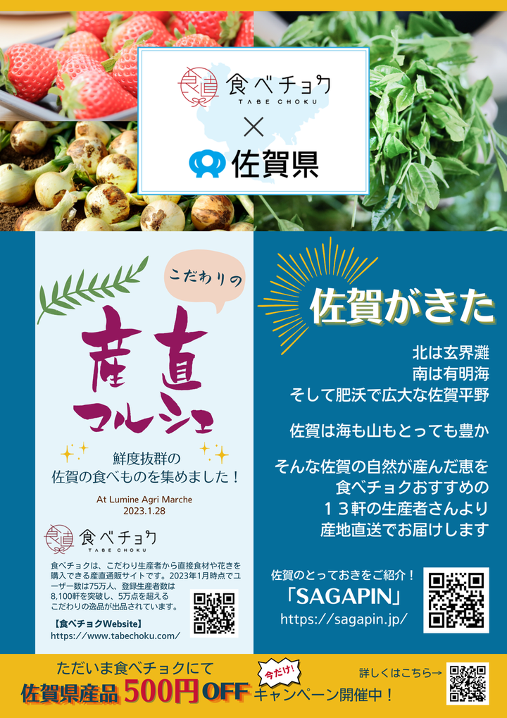 2023年1月、佐賀県産品マルシェの制作物全般を担当しました。 出品した12商品がほぼ完売し、同イベントの平均売上を大幅に上回る異例の結果になりました。 また、当日は10年に一度と言われる大寒波のため、輸送に不安がありました。 前日に急遽20分でPOPを作成し、緊急事態に備えました。