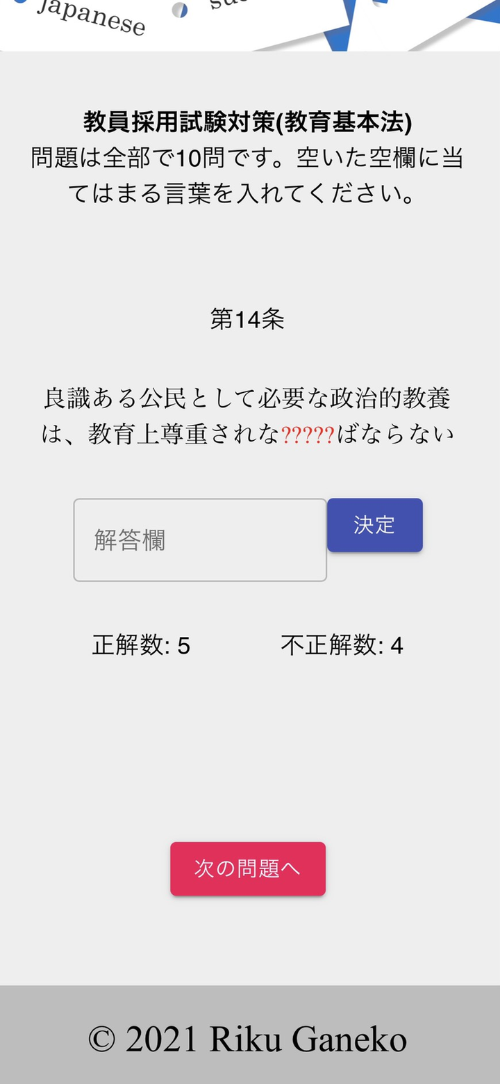 Riku Ganekoオリジナルアプリ(React)周りに教員志望の人がたくさんいるので、教員採用試験対策Appをつくってみました。 リンクを下に貼ります。huruya-rei-9.github.io でさらに詳しく