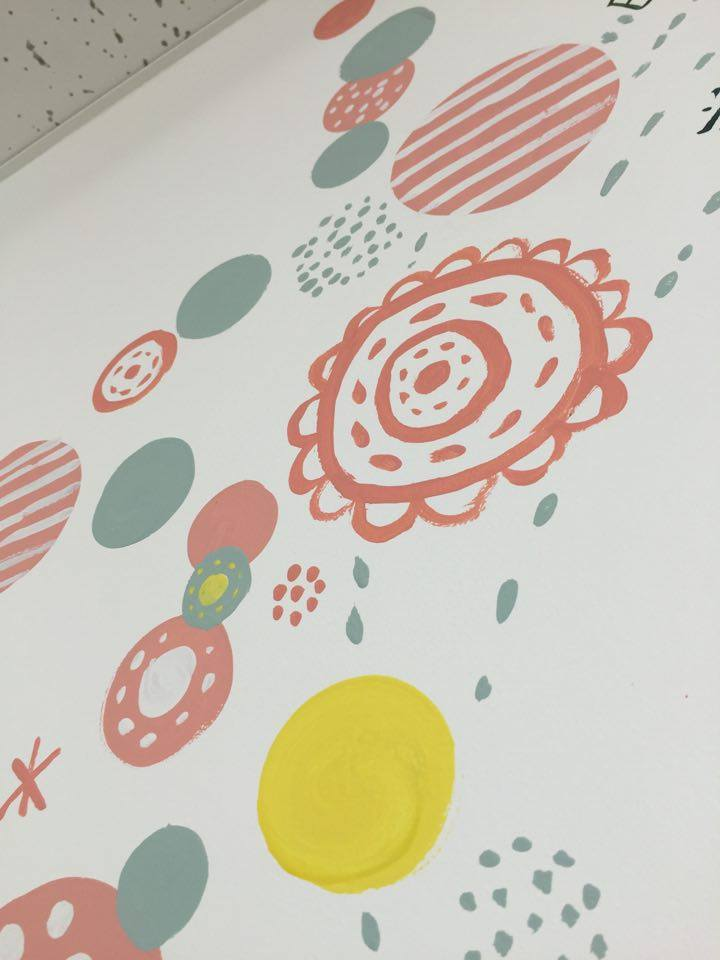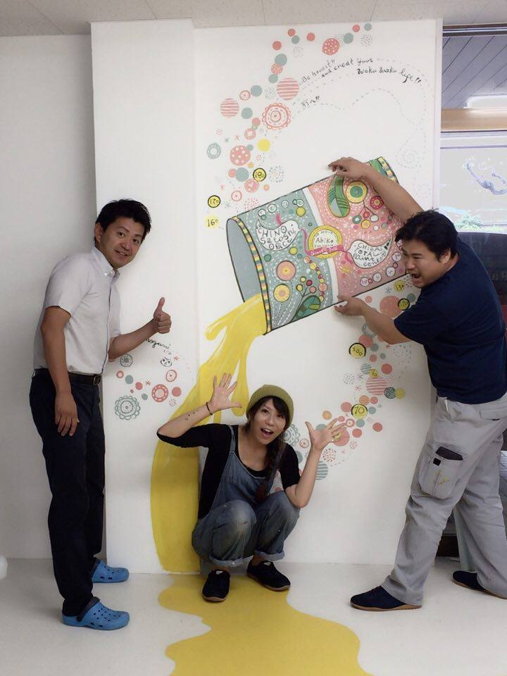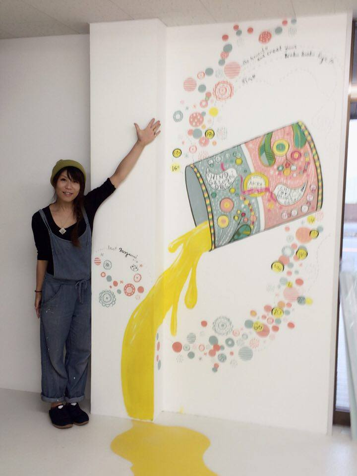 【和田総職&ちの理事務所】壁面ペイント【夢をぶちまけろ!!】 我孫子市議会議員ちの理事務所・和田総職(塗装業) 2016年7月2日のリニューアルオープン時に描いた絵です。 近隣の小学生がよく立ち寄るとの事で、このようなフォトスポットとして楽しんでもらえるスタイルにしました! 周りの丸のデザインのなかには、身長を測れる(ざっくりとした)メモリが隠れているので、訪れる度にお子さんの成長を感じられる場所でもあればいいなと。 そして、和田総職さんは塗装屋さん、ちの理さんは市議会議員さん。 夢の缶から溢れ出る黄色いペンキ的な良い感じのが、異なる職種のシェアオフィスでこう、開かれた、希望にあふれた、そんな感じなアレになれば嬉しいです!! 余談ですが、黄色くあふれるものを見るといつも、 スピッツの「チェリー」を思い出します。 あの歌詞では「夢を運ぶ黄色い砂」だけど… すくってもすくっても、こぼれ落ちる希望は儚さを感じるのだけど、 こちらで最初にお話を伺った時からこぼれていたこの床の黄色… 「夢をぶちまけろ!!!」一択のフラグでした。 そんな感じで「チェリー」を口ずさみながら描いた作品となりました! 愛してるの響きだけで強くなれる気がしますよね!!