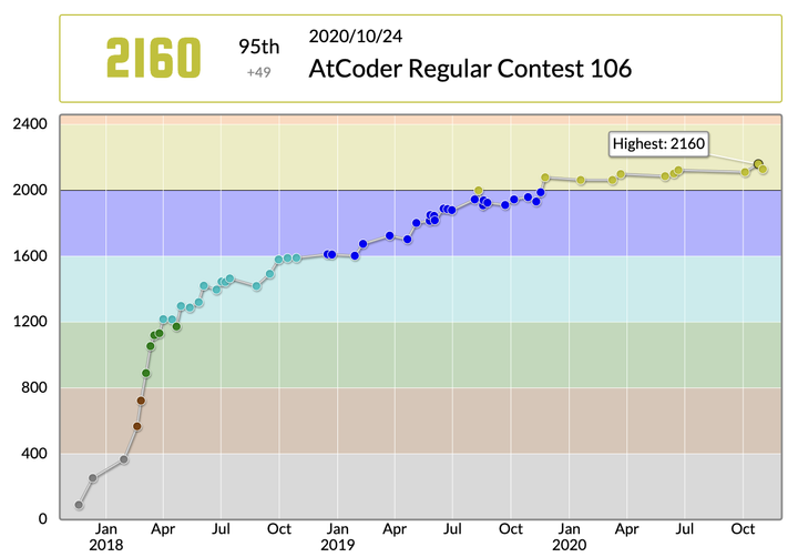 競技プログラミングのコンテストサイトAtCoderでレート2000(黄色)を達成