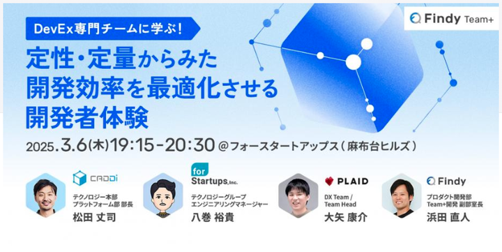 弊社での初エンジニアイベントの開催です。当日は私も登壇いたしました! 【フォースタートアップス×キャディ×プレイド×Findyが登壇!】DevEx専門チームに学ぶ!定性・定量からみた開発効率を最適化させる開発者体験【オフライン限定開催】