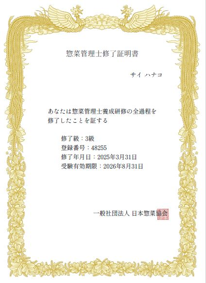 惣菜管理士3級を6か月間受講し、資格試験合格しました。