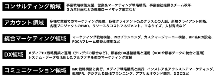 主に、マーケティングマネジメントを中心としたコンサルティング会社 企業の事業課題をマーケティングやコミュニケーションの力で解決し、成長を支援 多様な業種のスタートアップやエンプラ企業などを幅広くサポート