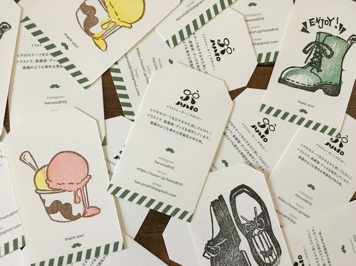 趣味で始めた消しゴムはんこのイラストを使ってグッズ制作活動をしており、その活動用の名刺をデザインしました。 グリーンのカラーをベースに、必要な情報を表面に集約し、裏面は実際に制作したはんこを1つ1つ手作業でスタンプする形で、作品の雰囲気に触れてもらえるような仕組みになっています。 また、イベント出展時には、各イベントに持ち込む記念はんこを押すことのできる台紙としても機能します。