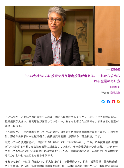 株式会社ネットプロテクションズホールディングが運営するメディア「THINKABOUT」での執筆記事。一定の基準を持って「いい会社」の答えを持つ資産運用会社「鎌倉投信」の代表取締役社長の鎌田恭幸さんに、これから求められる企業のあり方を取材、執筆しました。