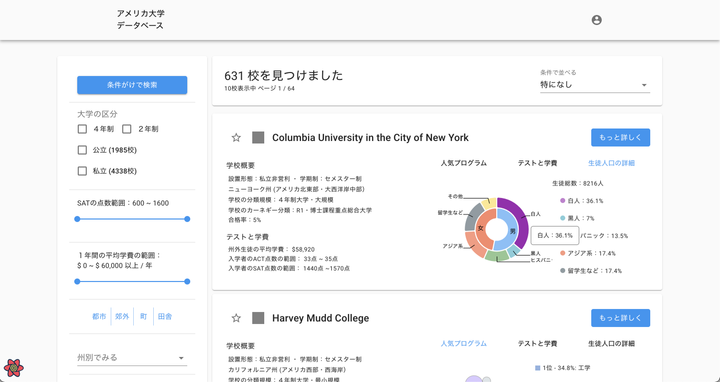 全米6300+校の大学の情報を一目瞭然できるサイトをReact / Node / Firebase / D3で作成。 リポジトリ:https://github.com/DrPoppyseed/daigakudatabase サイト:https://daigakudatabase-dev.netlify.app