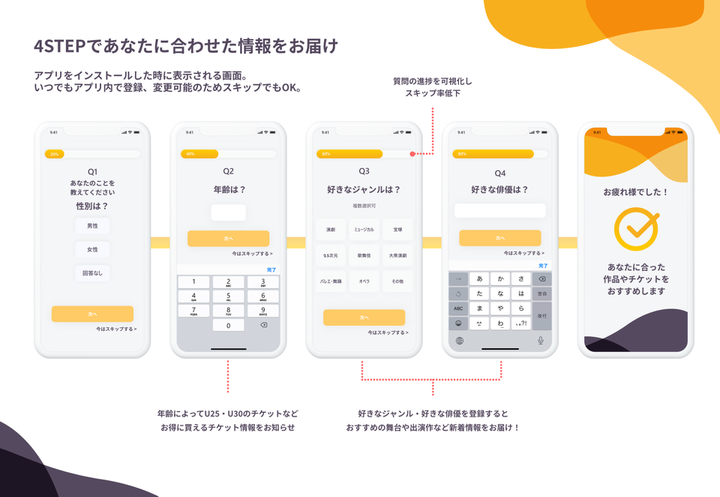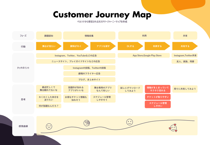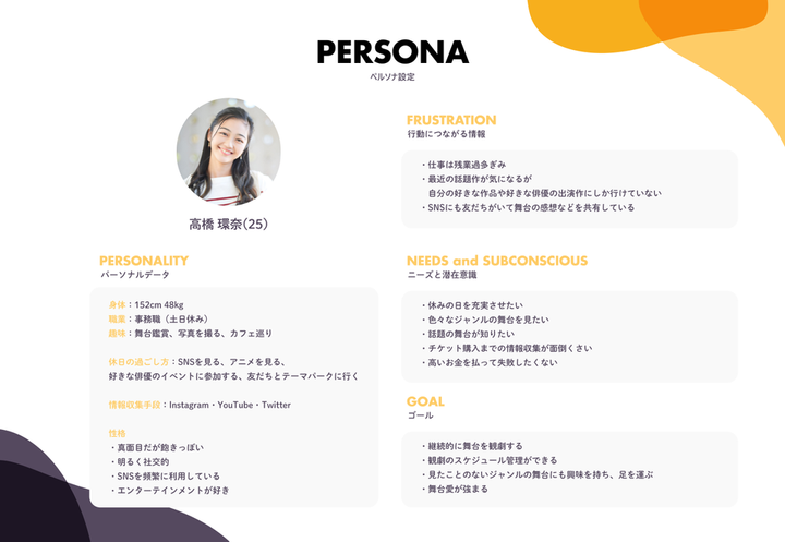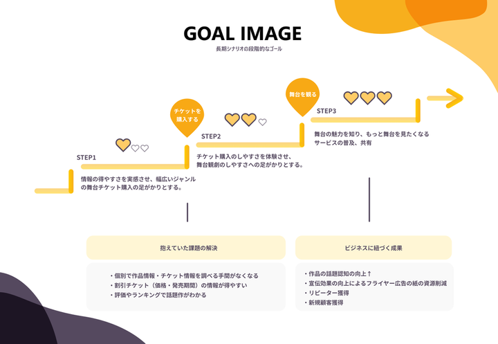 「本当に自分が欲しいと思えるサービスをつくってみる」を個人テーマとして制作。 私の趣味は舞台観劇で、 学生時代に4年半ほど劇場スタッフのアルバイトをしていた経緯があります。 「日本の演劇業界を盛り上げたい」 「興味を持ってもらい、たくさんの人に劇場に足を運んでもらいたい」という思いから制作しました。 上記の「GOAL IMAGE」(長期シナリオの段階的なゴール)で課題の解決とビジネスに紐づく成果をまとめました。サービスで得られる体験により、1歩ずつステップを踏んで、最終的に舞台の魅力が伝わり、新規・リピーターの顧客獲得を長期的な目標として設定しています。♡はユーザー幸福度を表しました。 今回初めてペルソナやカスタマージャーニーマップを作成しましたが、ターゲットの人物像や心理的変化、行動のステップをビジュアルに落としこむことで 製品の取り入れるべき機能と、それに伴うユーザーの行動変容が頭のなかで整理されていく感覚がありました。 デザイン戦略の一つの手段として、実務でも効果的に使っていきたいと思います。 制作時間:5日 使用ツール:XD・Illustrator 個人制作(学習目的)