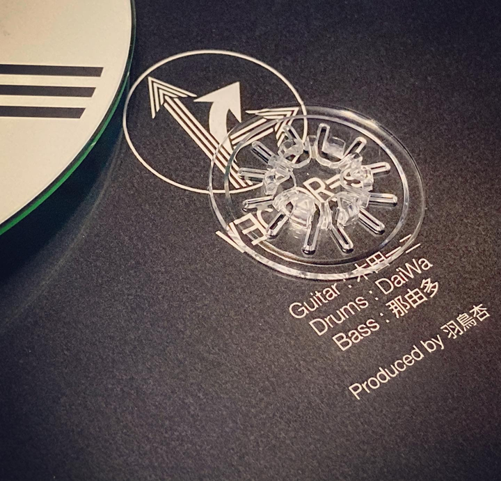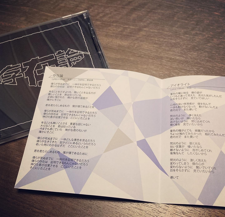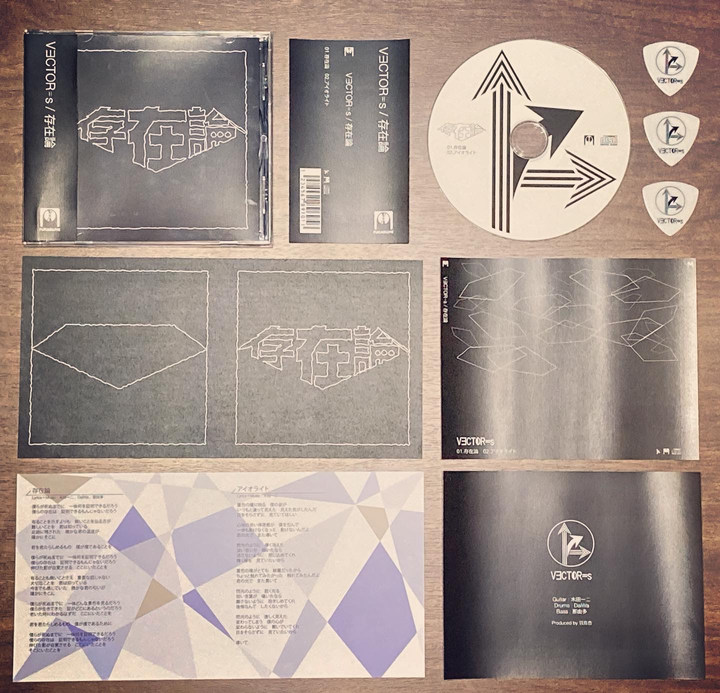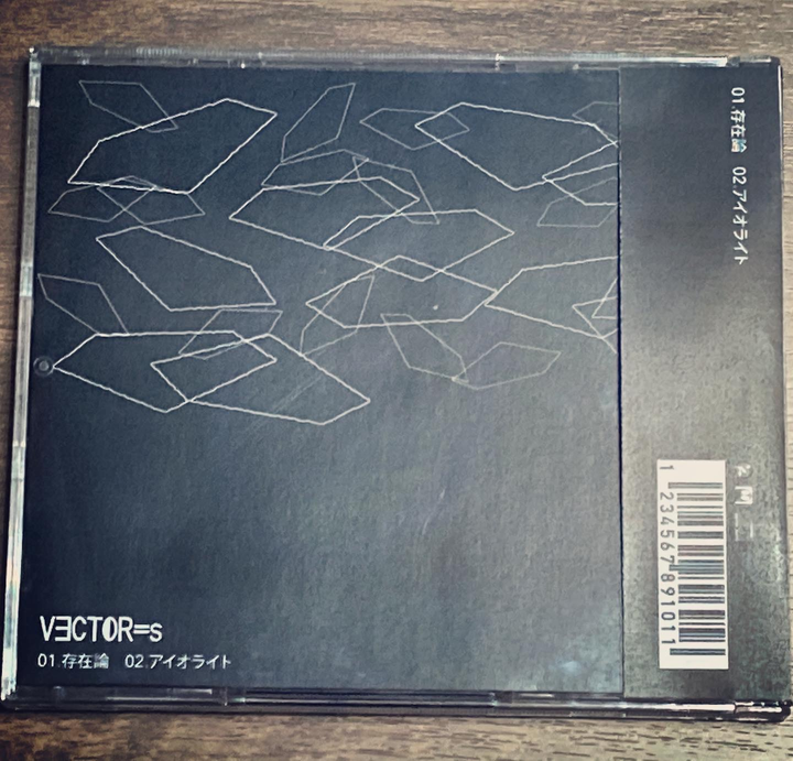 このコロナ禍に好きなバンドのライブへ気軽に行けず気が沈むことも多かったので、架空のバンドであるV∃CTOR=s(ベクターズ)を作り、彼らのロゴから、ファーストシングルとなるCDの盤面やジャケットのデザイン、架空のレーベルのロゴデザインまで行いました。 V∃CTOR=sは方向性がバラバラな三人が集ったスリーピースバンドであり、バンド名は「ベクトル」から来ています。「∃」は存在限定子という数学の記号を使用しています。 バンドを象徴するロゴには異形矢印の「指定方向外進行禁止」の標識をモチーフに使っています。 メンバーは、JPOP路線を目指すギターの木田一二、パンクロックが好きなドラムのDaiWa、ヴィジュアル系を突き進むベースの那由多、で構成されているという設定です。 シングルは毎回メインを三人で作詞曲し、カップリングをメンバーの誰かが一人で作詞曲する、それをローテーションでリリースする…という設定で作りました。 今回はカップリング曲をギターの木田が作ったという設定なので、JPOPっぽい歌詞を考えました。 バンドにとっては最初のシングルとなるので、羅針盤として使われていたらしい「アイオライト」という天然石をモチーフにしました。 ジャケットロゴの形をブリリアントカットの形にしたり、歌詞のページにはアイオライトの色を使ったりと、モチーフを統一して散りばめました。 形だけではありますが、CDを実際に作ってみると存在感が増して実在のバンドを応援しているような気分になれて最高でした。