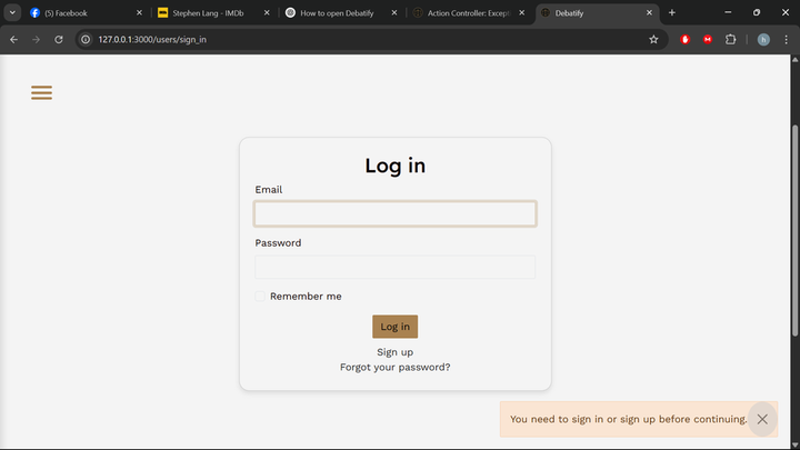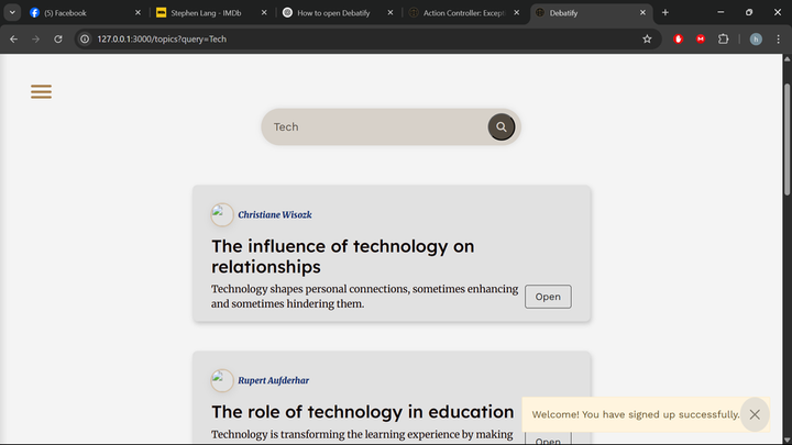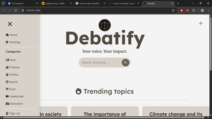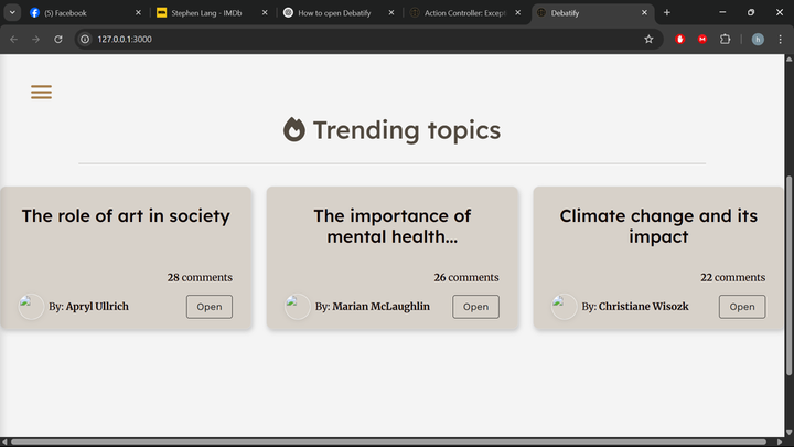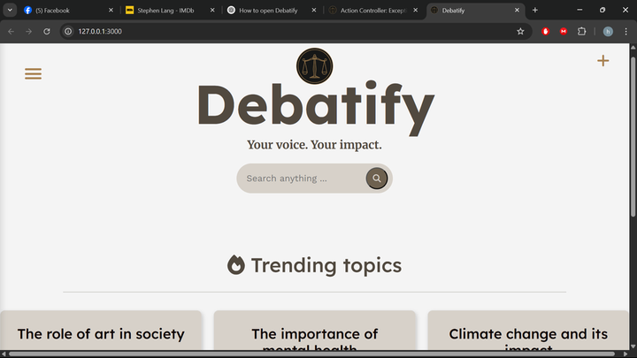 Debatify | Team Project Ruby on Rails, JavaScript, PostgreSQL A full-stack web application that allows users to create, join, and engage in structured debates. Users can post debate topics, comment, and upvote arguments to promote meaningful discussion. Built with user authentication, nested comment threads, and a voting system to enhance interaction and engagement. Developed as a final project during the Le Wagon bootcamp in a collaborative team environment.