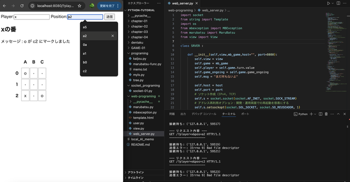 私は、Pythonを使ってまるばつゲームをコマンドライン版から実装し、Webアプリケーション化・デバッグまで行うことで、ソフトウェア開発の一連の流れを体験しました。特に、クラス化を使った再設計・実装や、正常系・異常系のエラーのデバッグを通して、ソフトウェア設計の重要性を学ぶことができました。また、ソケットプログラミングを通じて、ウェブの仕組み(リクエスト・応答など)について理解を深めたことは、今後のウェブ開発において大きな助けになると感じています。 最終的には、コマンドライン版からWebアプリケーション化を行いました。将来的には、二人対戦機能やAI対戦機能の実装も検討しており、サーバー設計・実装スキルの向上を目指しています。この経験を通じて、将来的にはより複雑なWebアプリケーションやリアルタイム通信を必要とするシステム開発にも挑戦したいと考えています。 ※リンクされたGitHubリポジトリでは、コマンドライン版のまるばつゲームのコードを公開しています。Webアプリケーション版は現在リファクタリング中ですが、近日中に公開予定です。
