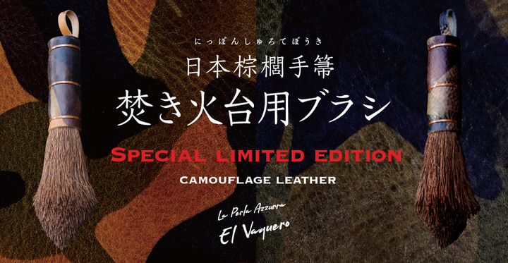 hinataオリジナルギアとして最初にローンチした「hinata x 深海産業 焚き火台用ブラシ 日本棕櫚手箒」発売1周年を記念し、数量限定スペシャル版として新登場! スペシャル版の注目ポイントは、ハンドルに採用した高級イタリアンレザー。イタリア・トスカーナ州の名門「ラ・ペッラ・アズーラ社」による迷彩柄レザー「エル ヴァケーロ」を贅沢に使用しました。1色ずつ3度の染色・乾燥を繰り返し仕上げたこのレザーは、使い込むほどに味が出る逸品です。 レザーの総柄を使用していることから、職人が革を型取りした場所により柄が異なり、他人と被らない唯一無二の一点ものとなります!