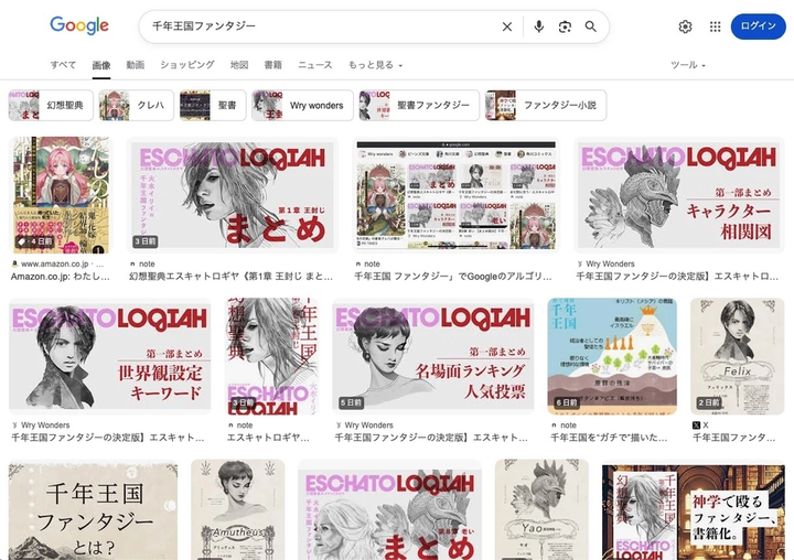 2025年6月26日|Google画像検索結果「千年王国ファンタジー」にて、ファーストビューをほぼ独占。左上の「私のつくった千年王国(Amazon)」以外は、すべて上杉麻未の個人プロジェクトによる発信物です。