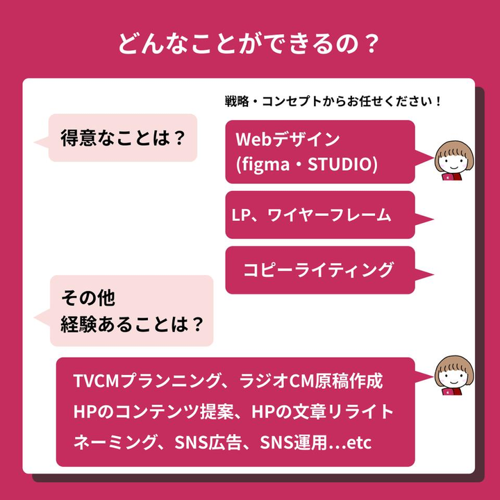 広告代理店でコピーライター・プランナーとして3年弱働いた経験を活かし、ディレクション/Webデザイナー/コピーライターとしてフリーランスで活動しています。