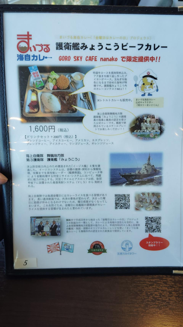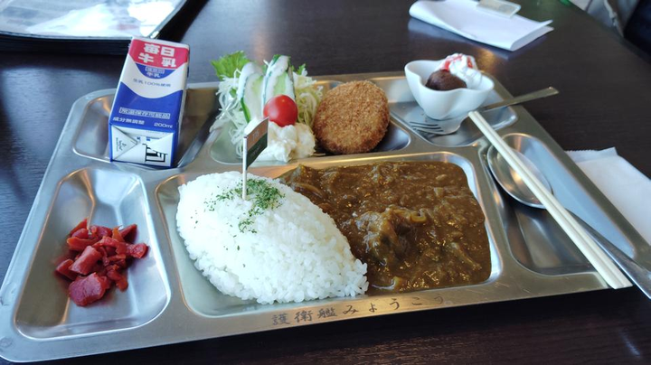 神戸から一般道を進軍すること、約3時間半。ようやくたどり着きました。この日はご覧の通りの快晴で、汗ばむ陽気です。この地での目的はただひとつ、護衛艦みょうこうビーフカレーを胃に収めることでした。金属製トレイに載って運ばれてきたカレーは大変甘く、また具材がゴロゴロ入っているために咀嚼も増え、食事の満足感は必要以上に高みへと登っていたように思えます。また牛乳がいい味出してました。ちなみに、この金属製トレイは土産物屋さんで販売されていましたが、7000円前後(あやふやな記憶)していたので、いいおっさんでしたが手が出ませんでした。よーし、お年玉もらったら買うぞー(オイオイ、アゲルホウダ)