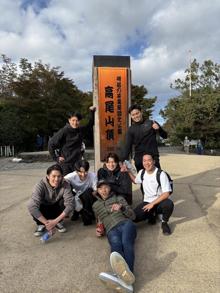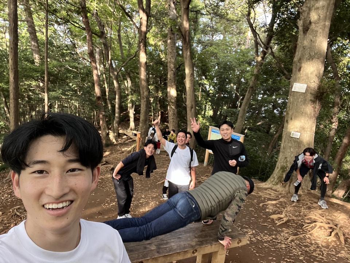 高尾山の皆で登りました! ネガティブなワードを声にしたら腕立て10回ルールを行い 緑色の服を着ている月岡が腕立て中ですw