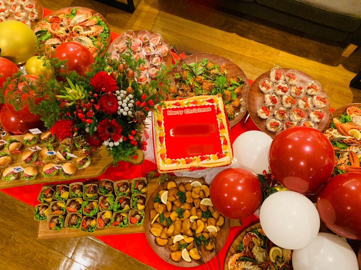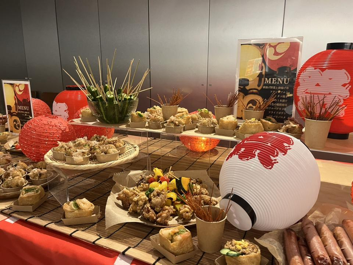現在は、お客様からのご要望を形にするためにお打ち合わせを行っています。 イベントのテーマやイメージを聞き、装飾や料理の提案をし、それを形にするためにコーディネーターやキッチンメンバーと相談して当日を迎えています。 ①1枚目のテーマ【ボクシング】 全体的に黒色にして、写真を使ってボクシングの臨場感を表しています。 ②2枚目のテーマ【祭】 ケータリングの形式でお祭り気分を味わってもらうために装飾やメニューにこだわりました。 ③3枚目のテーマ【クリスマス】 クリスマスカラーをふんだんに使って、バルーンでパーティーらしさを表現しています