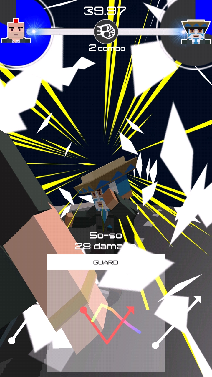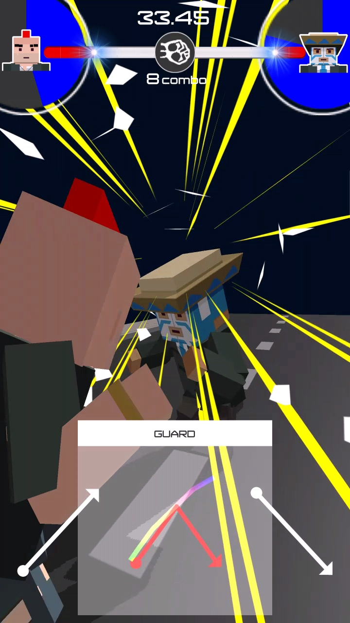 このゲームはタッチジェスチャーで技を繰り出して、いかに敵を早く倒せるかを競うゲームだぜ!早いタイムで倒せたらランキングに登録できるぞ!名前を入力するだけなので、ぜひチャレンジしてみてくれ!(※ランキングは開発者にビール(中)をおごると参加できます。) 攻撃、ガード、必殺技を使いこなして、最速チャンピオンを目指してくれ!